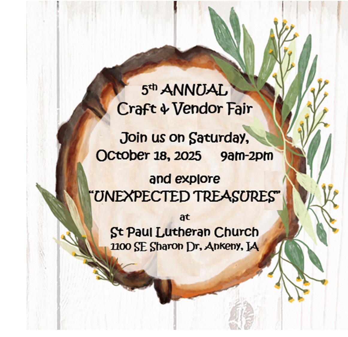 Mark your calendars to join us for our 5th Annual Craft & Vendor Fair on Saturday, October 18, 2025, 9am – 2pm, located INDOORS at St Paul Lutheran Church, Ankeny!